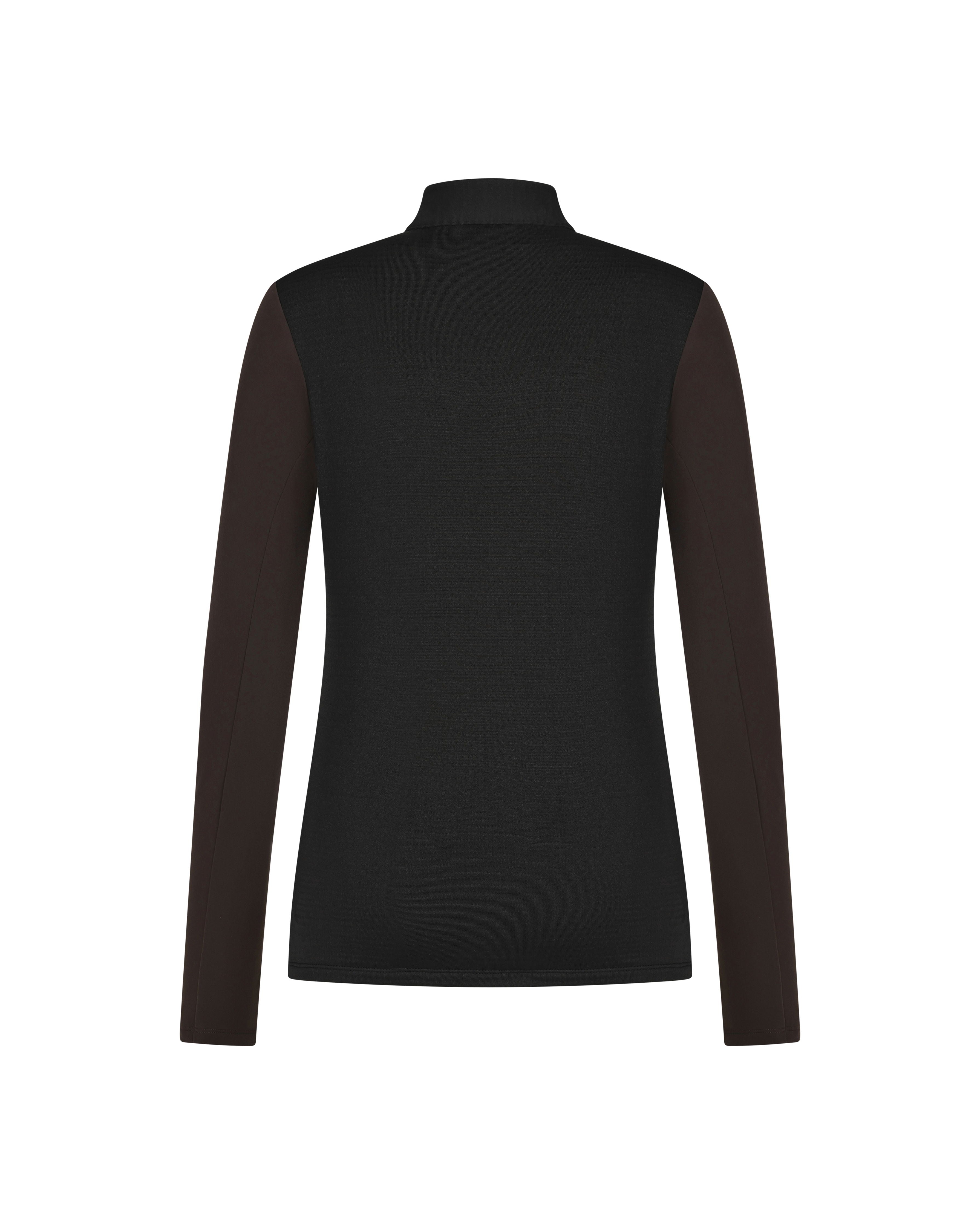 Hybrid technical top constructed with performance fabrics for warmth, breathability, and next-to-skin comfort. The body and collar feature Grid Fleece by Tecnopile® — a structured fabric designed to retain heat and manage moisture. Sleeves are made from Colorado by Carvico, a smooth warp-knit material with a brushed interior for softness, stretch, and quick-dry performance.