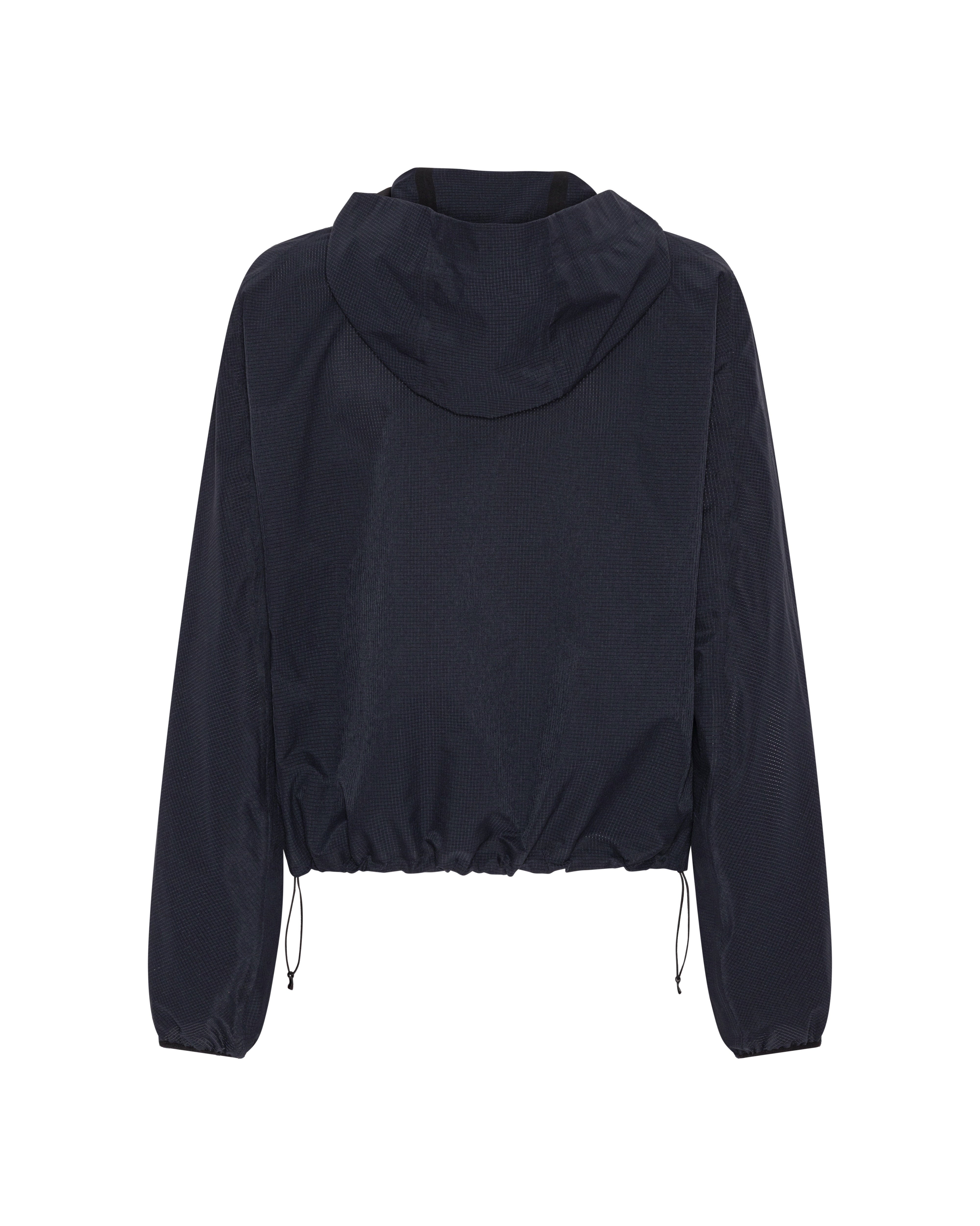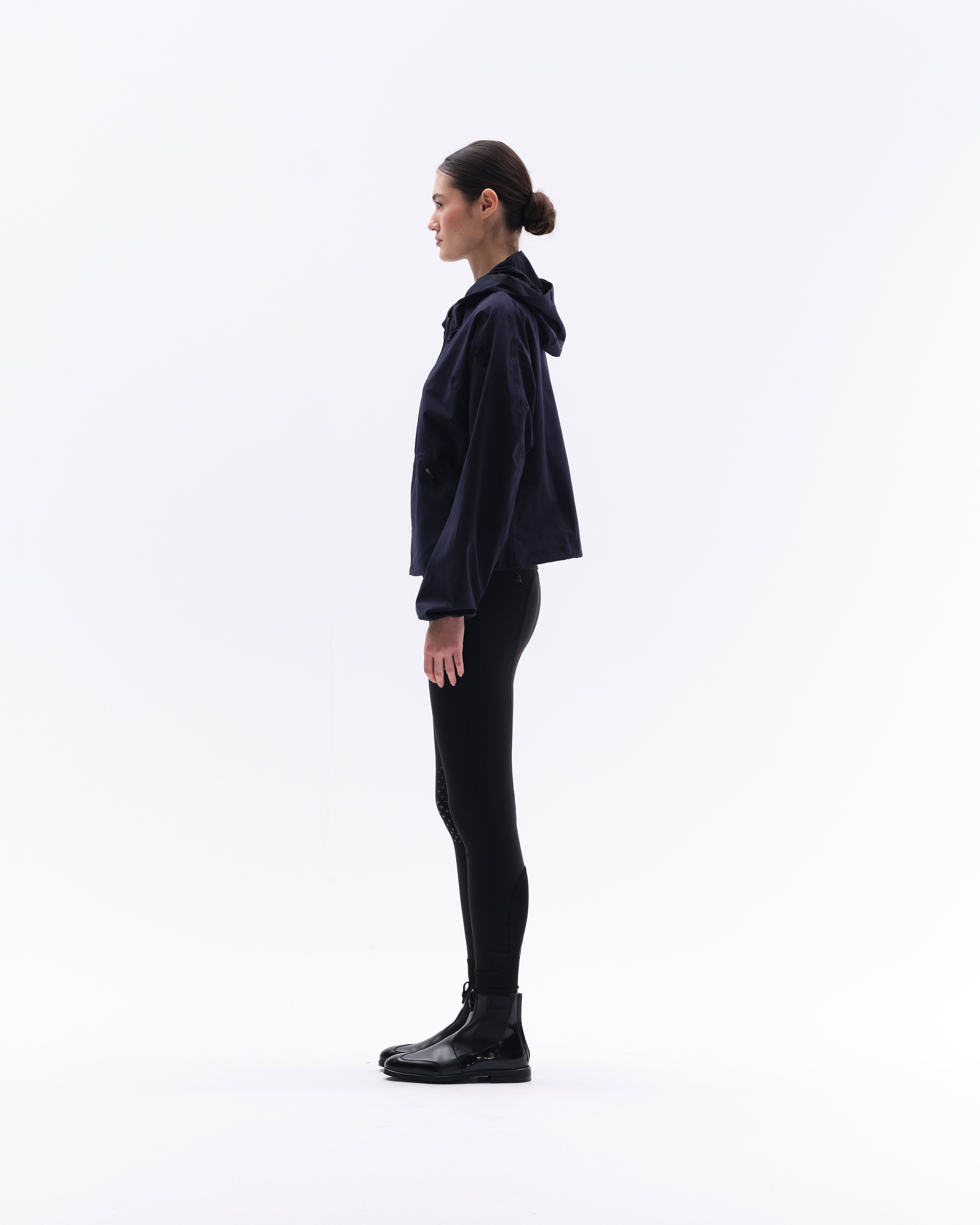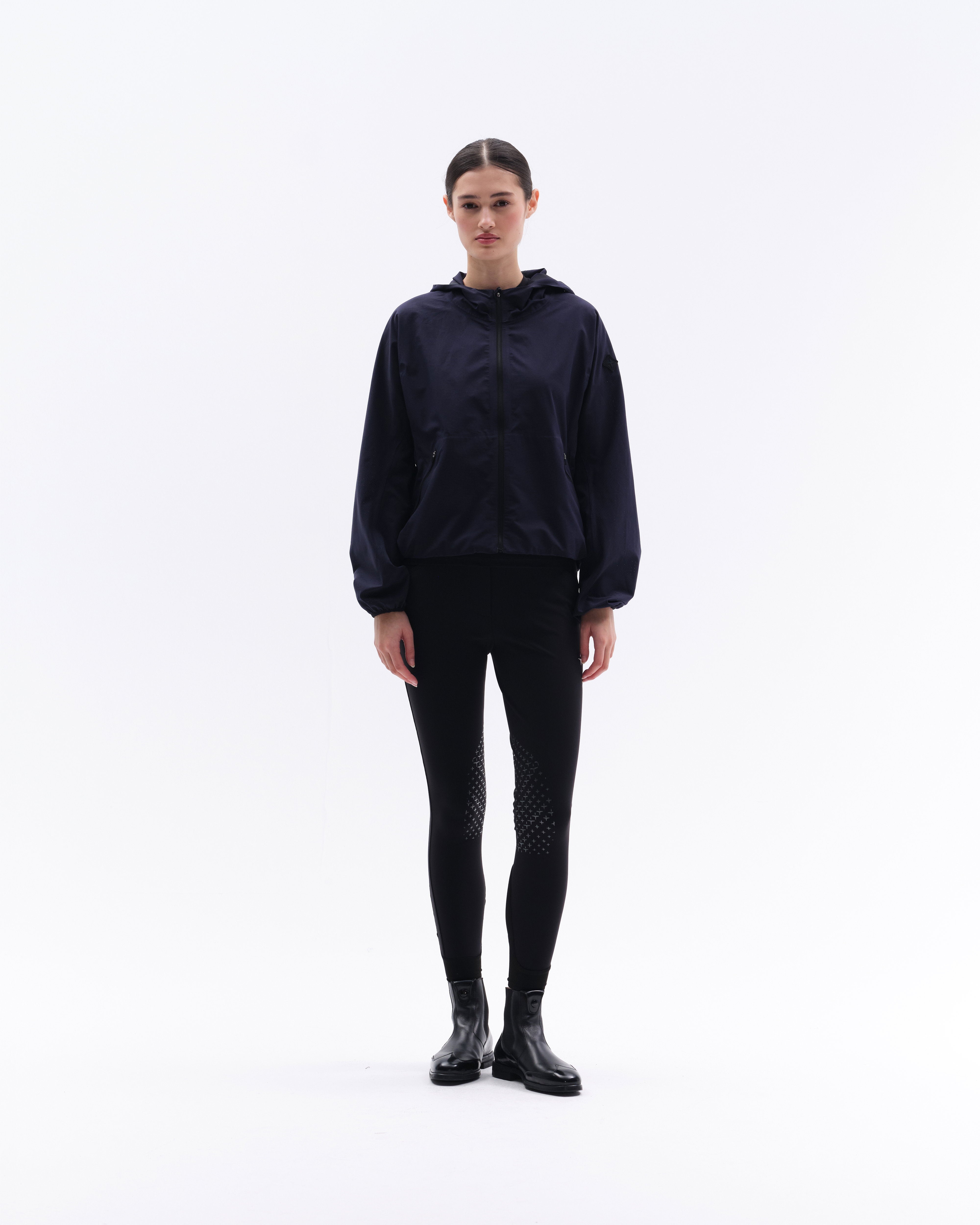 Lightweight hooded bomber jacket made from COOL DOT™, an eco-friendly stretch material designed to release body heat and dry quickly for optimal comfort. The adjustable elastic drawstrings at the hem and hood allow for a personalized fit, while inside hotfix seams ensure a clean finish and enhanced durability.
