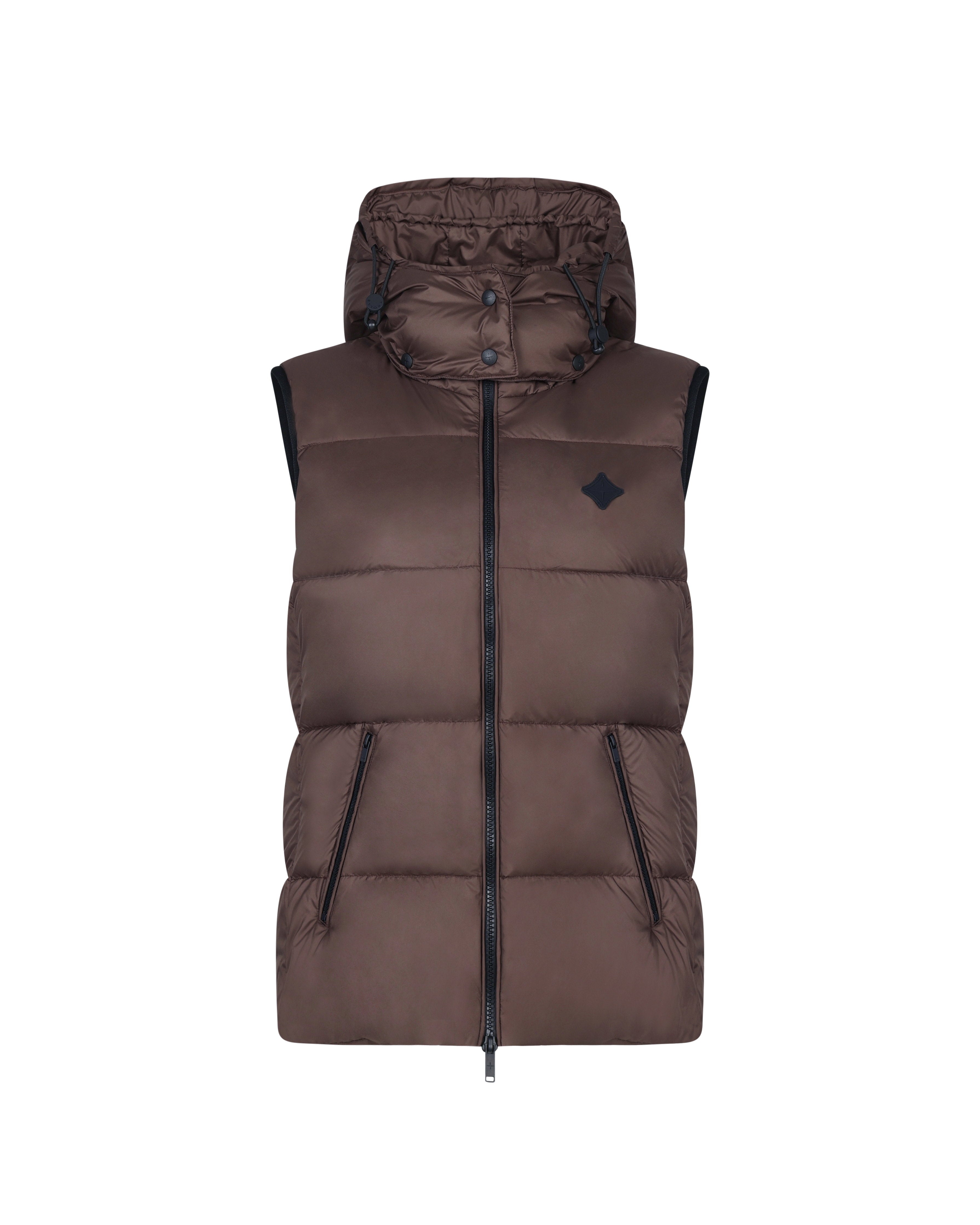 Lightweight sleeveless down jacket crafted from water-repellent polyester, offering high warmth-to-weight insulation in a streamlined design. A detachable hood and padded pocket detailing provide versatile functionality with a refined silhouette.