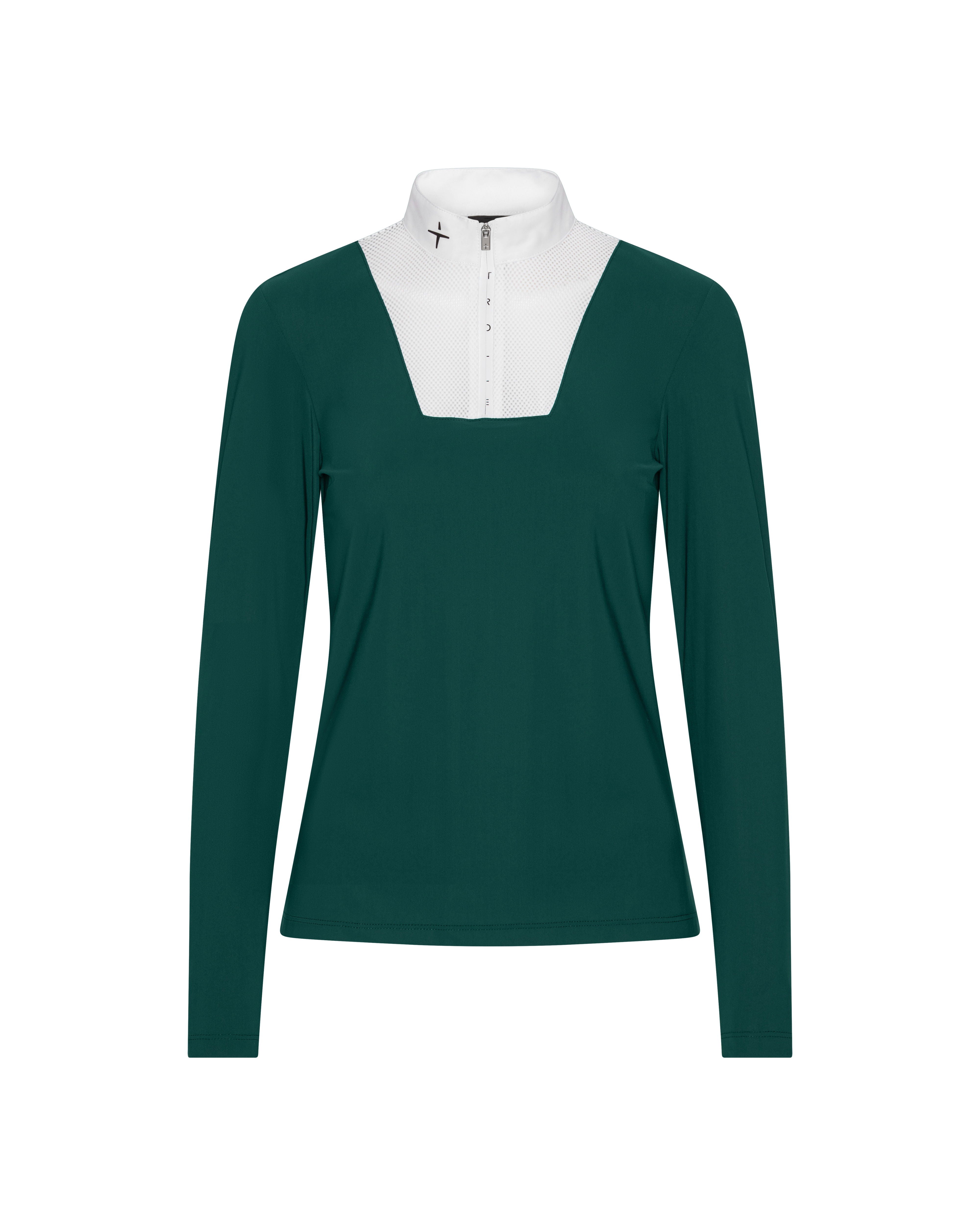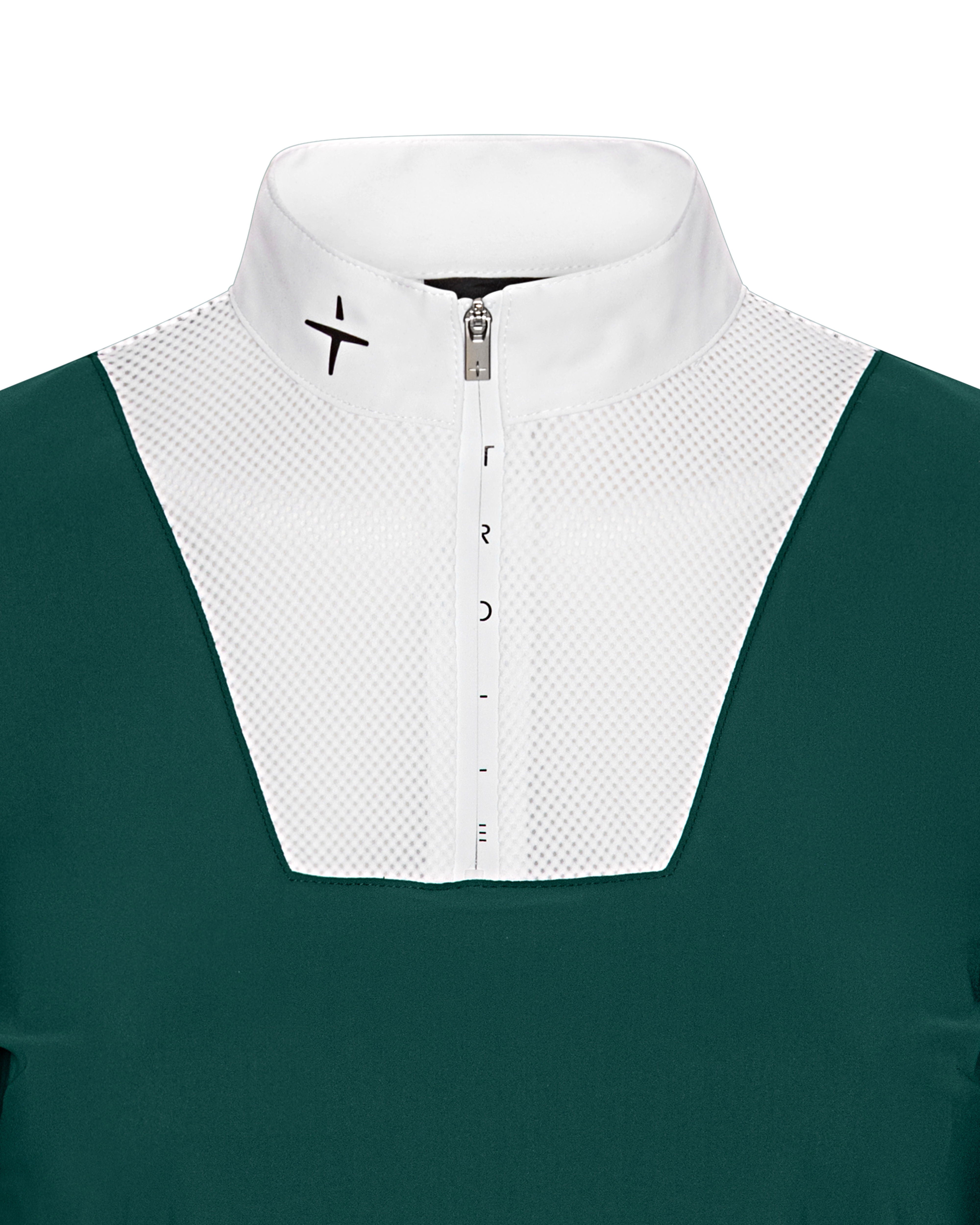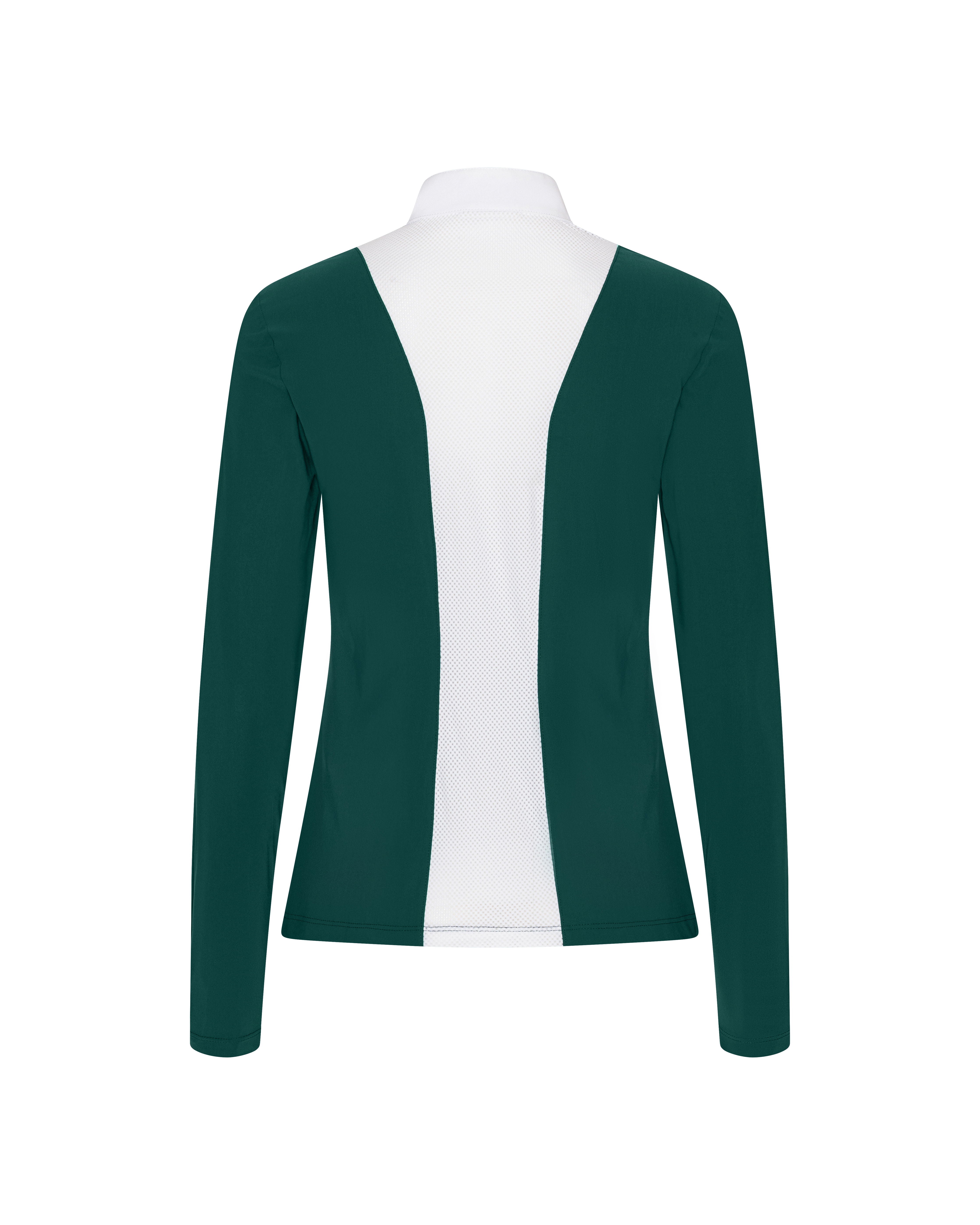 Designed for competition, this long-sleeve polo is crafted from breathable, quick-drying technical jersey to ensure comfort and performance. Mesh panels at the chest and back provide targeted ventilation and a sleek visual contrast. A crisp white collar and a sealed zip closure add a clean, competition-ready finish.