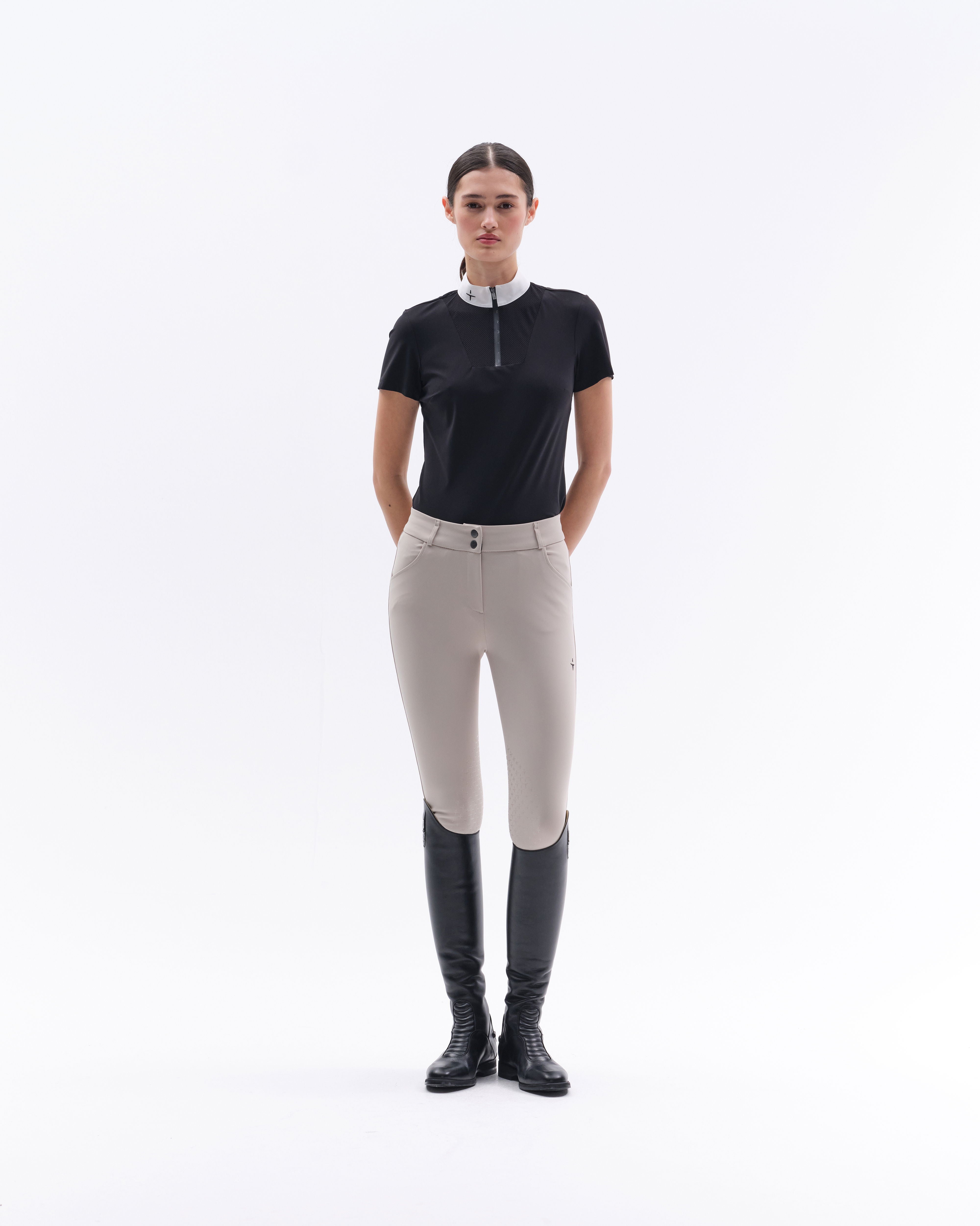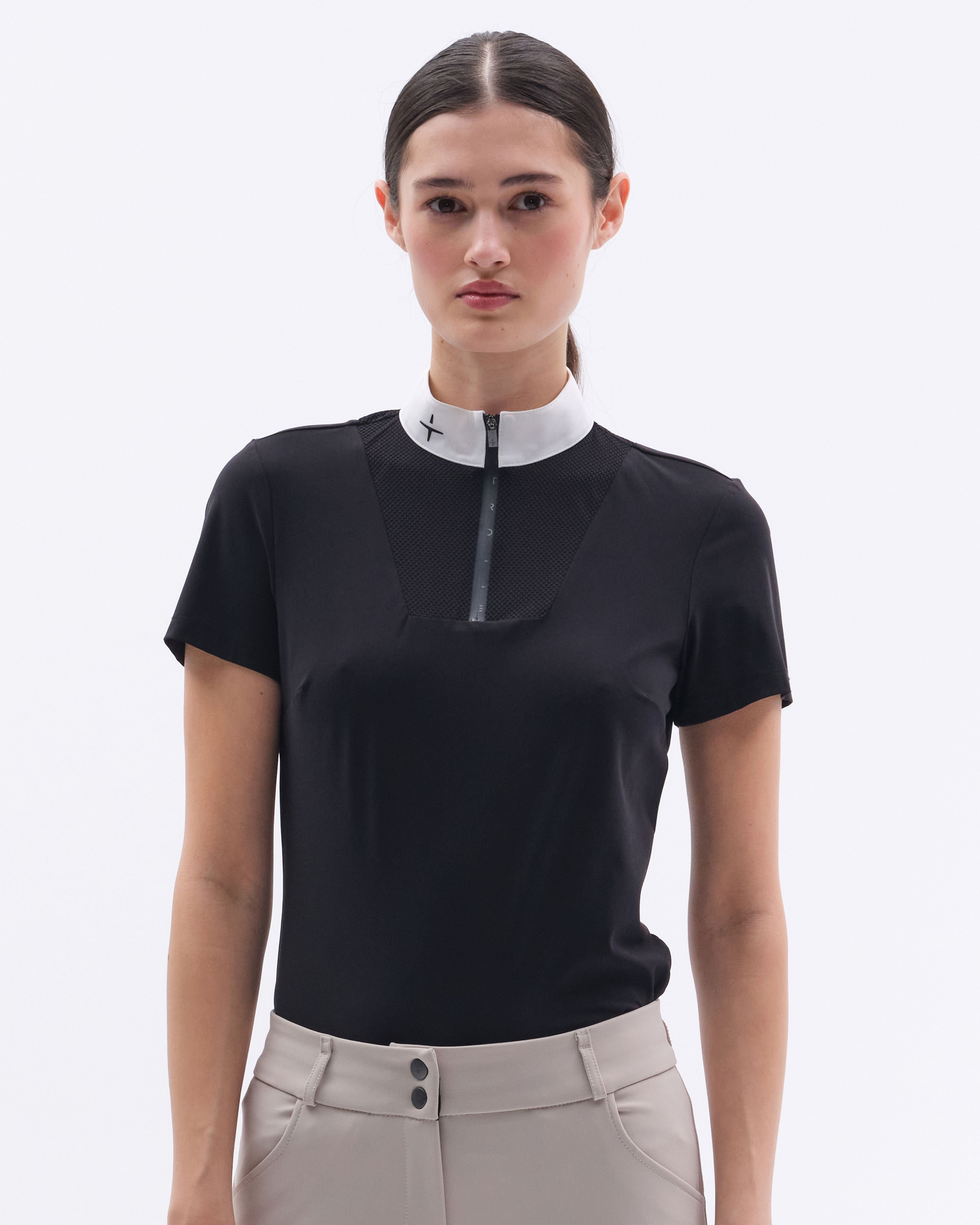 This slim-fit competition polo is crafted from breathable, quick-drying technical jersey, ensuring superior comfort and performance in demanding conditions. Mesh panels at the chest and back enhance airflow while creating a refined visual contrast. A crisp white stand-up collar and sealed front zipper complete the clean, polished competition silhouette.