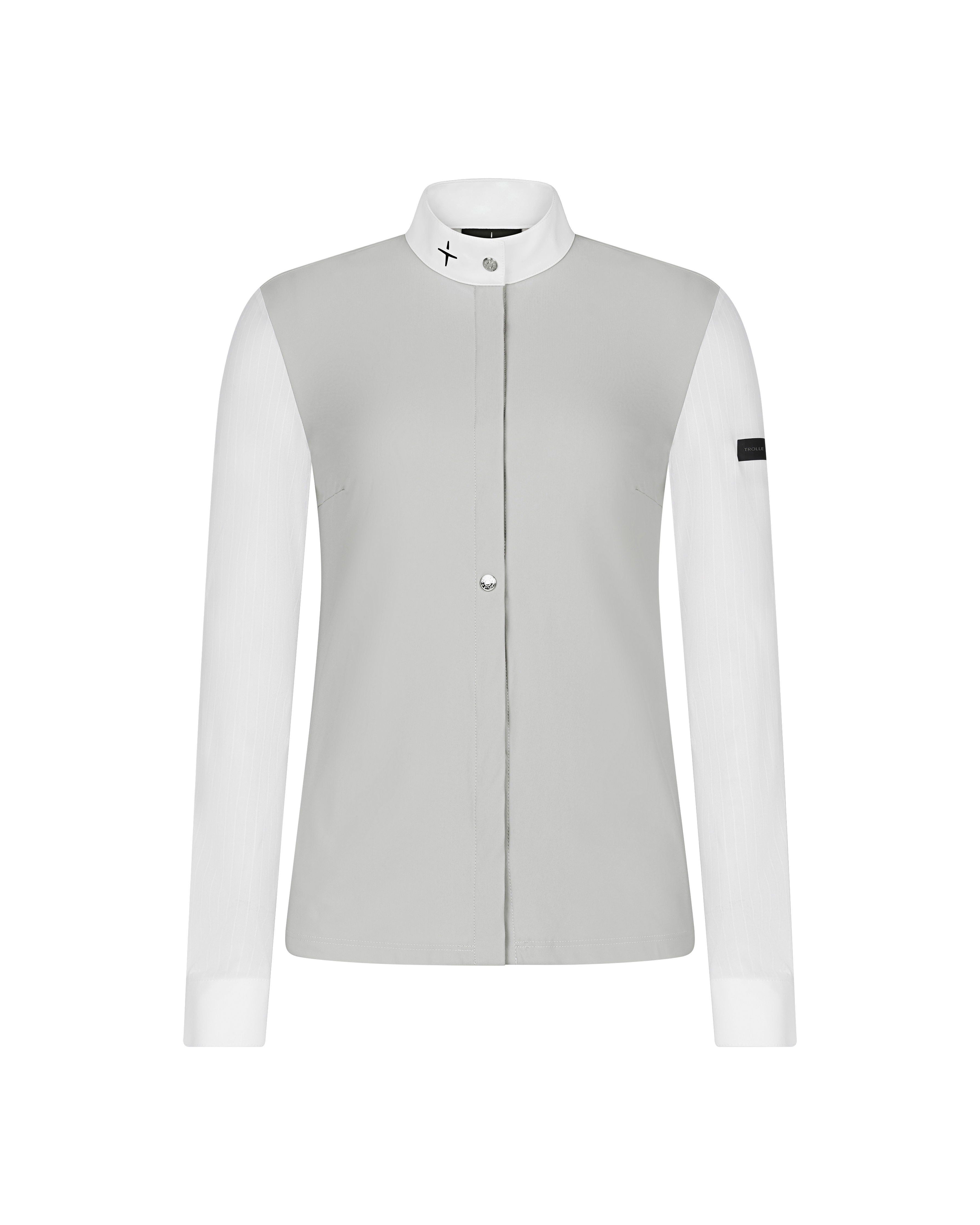 A performance show shirt combining clean structure with technical stretch. The body and collar are crafted from smooth jersey, while lightweight Aeroline™ sleeves provide breathability and mobility. Two visible metal buttons on an otherwise concealed placket create a sharp, modern finish. Wide cuffs and subtle logo details complete the design.